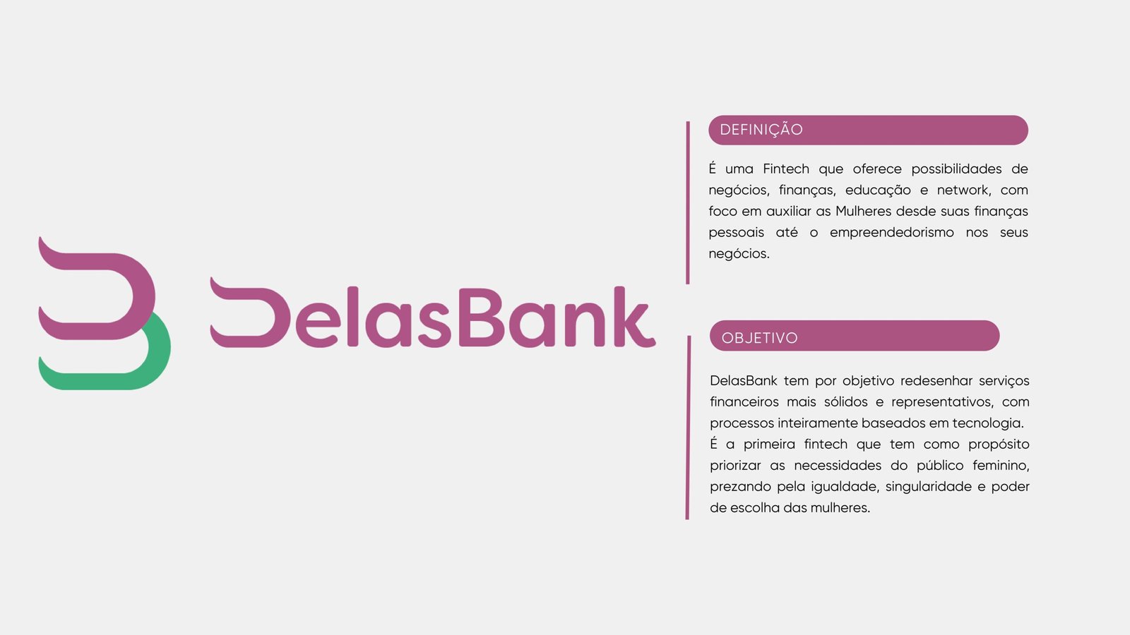 É a primeira fintech que tem como propósito priorizar as necessidades do público feminino, prezando pela igualdade, singularidade e poder de escolha das mulheres.
