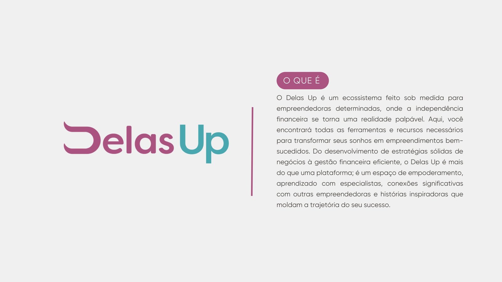 O Delas Up é um ecossistema feito sob medida para empreendedoras determinadas, onde a independência financeira se torna uma realidade palpável. Aqui, você encontrará todas as ferramentas e recursos necessários para transformar seus sonhos em empreendimentos bem sucedidos. Do desenvolvimento de estratégias sólidas de negócios à gestão financeira eficiente, o Delas Up é mais do que uma plataforma; é um espaço de empoderamento, aprendizado com especialistas, conexões significativas com outras empreendedoras e histórias inspiradoras que