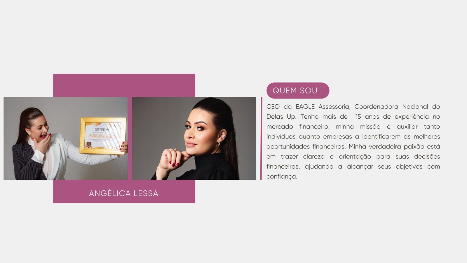 CEO da EAGLE Assessoria, Coordenadora Nacional do Delas Up. Tenho mais de 15 anos de experiência no mercado financeiro, minha missão é auxiliar tanto indivíduos quanto empresas a identificarem as melhores oportunidades financeiras. Minha verdadeira paixão está em trazer clareza e orientação para suas decisões financeiras, ajudando a alcançar seus objetivos com confiança.