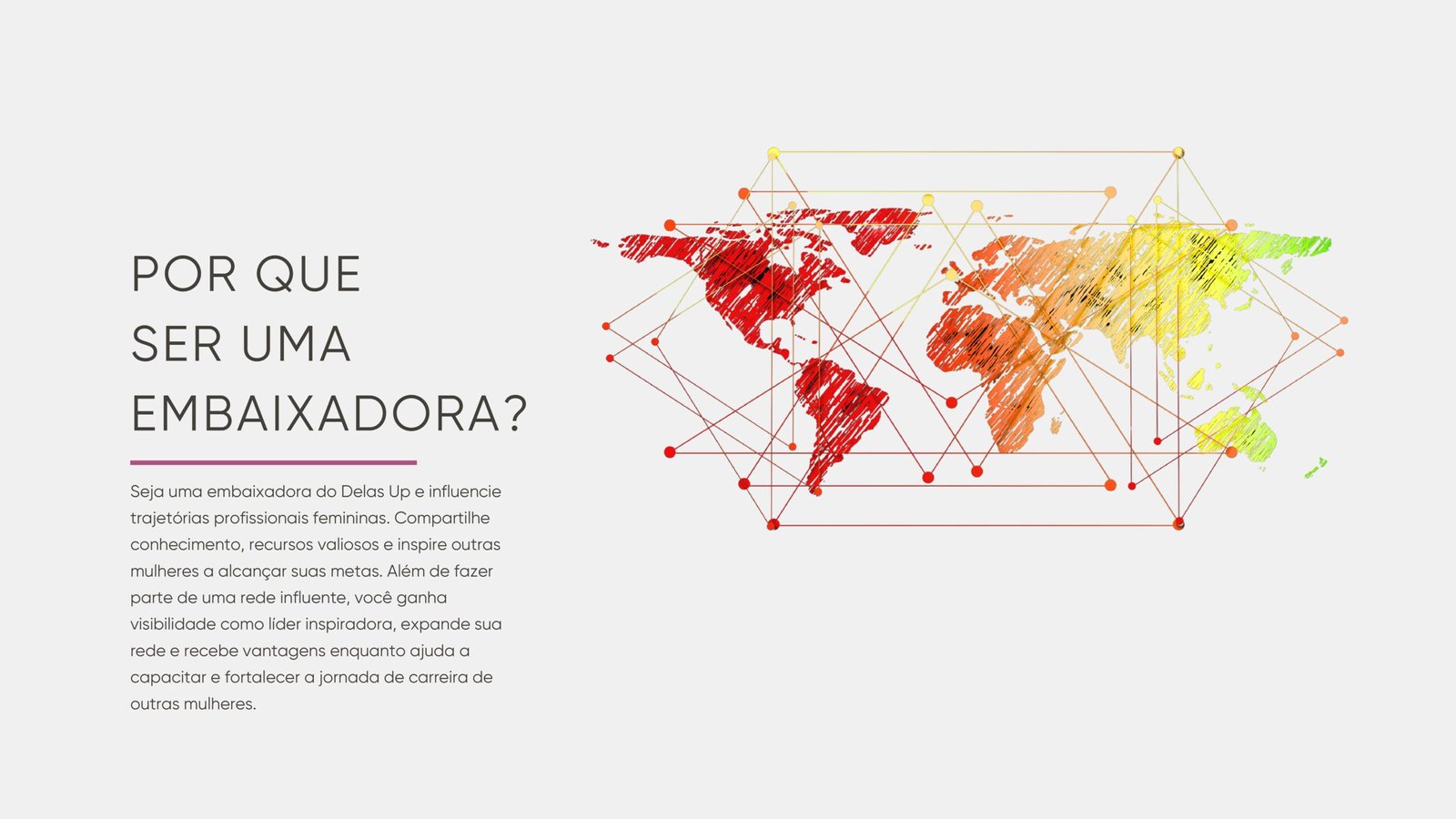 Seja uma embaixadora do Delas Up e influencie trajetórias profissionais femininas. Compartilhe conhecimento, recursos valiosos e inspire outras mulheres a alcançar suas metas. Além de fazer parte de uma rede influente, você ganha visibilidade como líder inspiradora, expande sua rede e recebe vantagens enquanto ajuda a capacitar e fortalecer a jornada de carreira de outras mulheres.