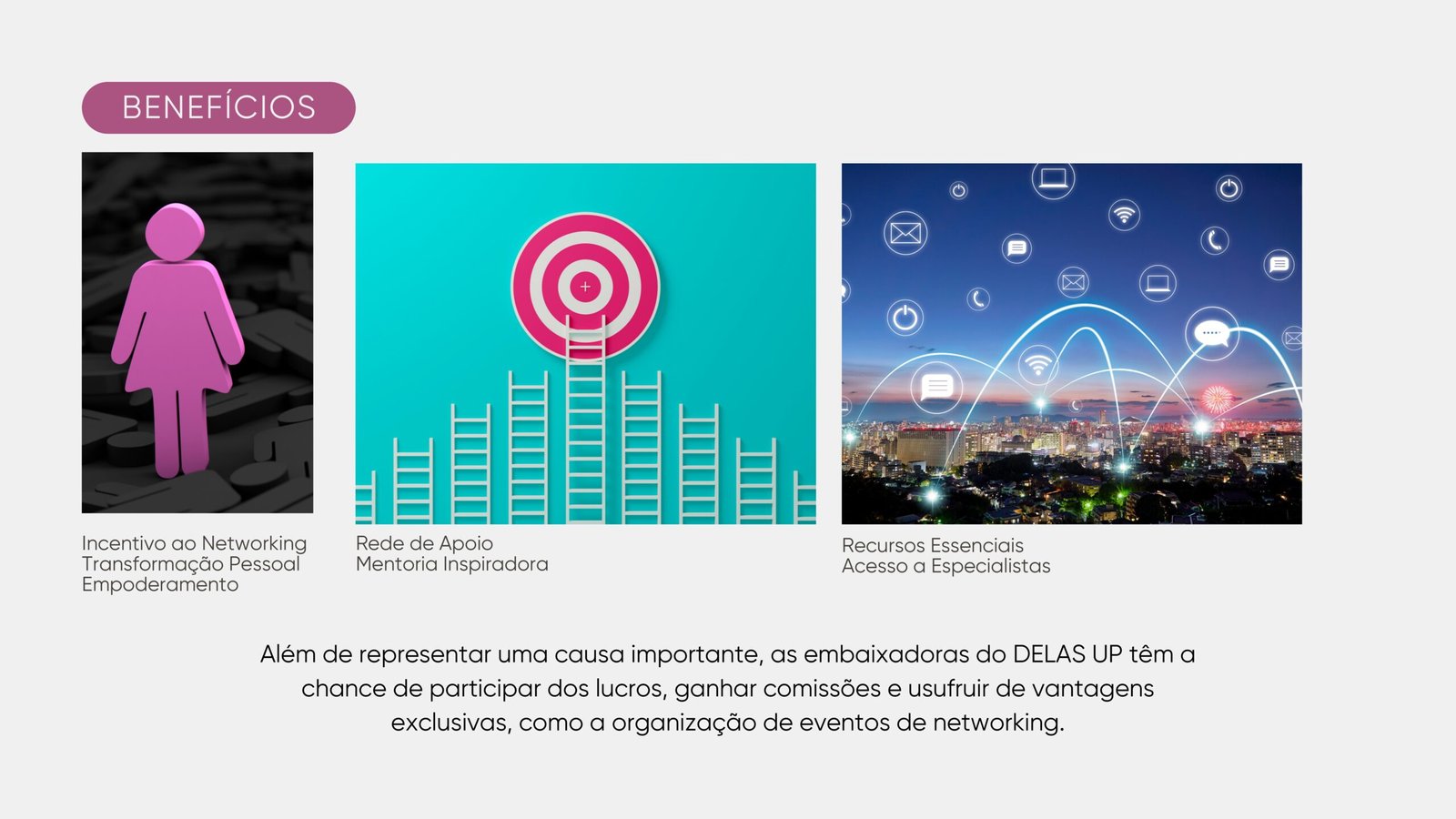 Além de representar uma causa importante, as embaixadoras do DELAS UP têm a chance de participar dos lucros, ganhar comissões e usufruir de vantagens exclusivas, como a organização de eventos de networking.